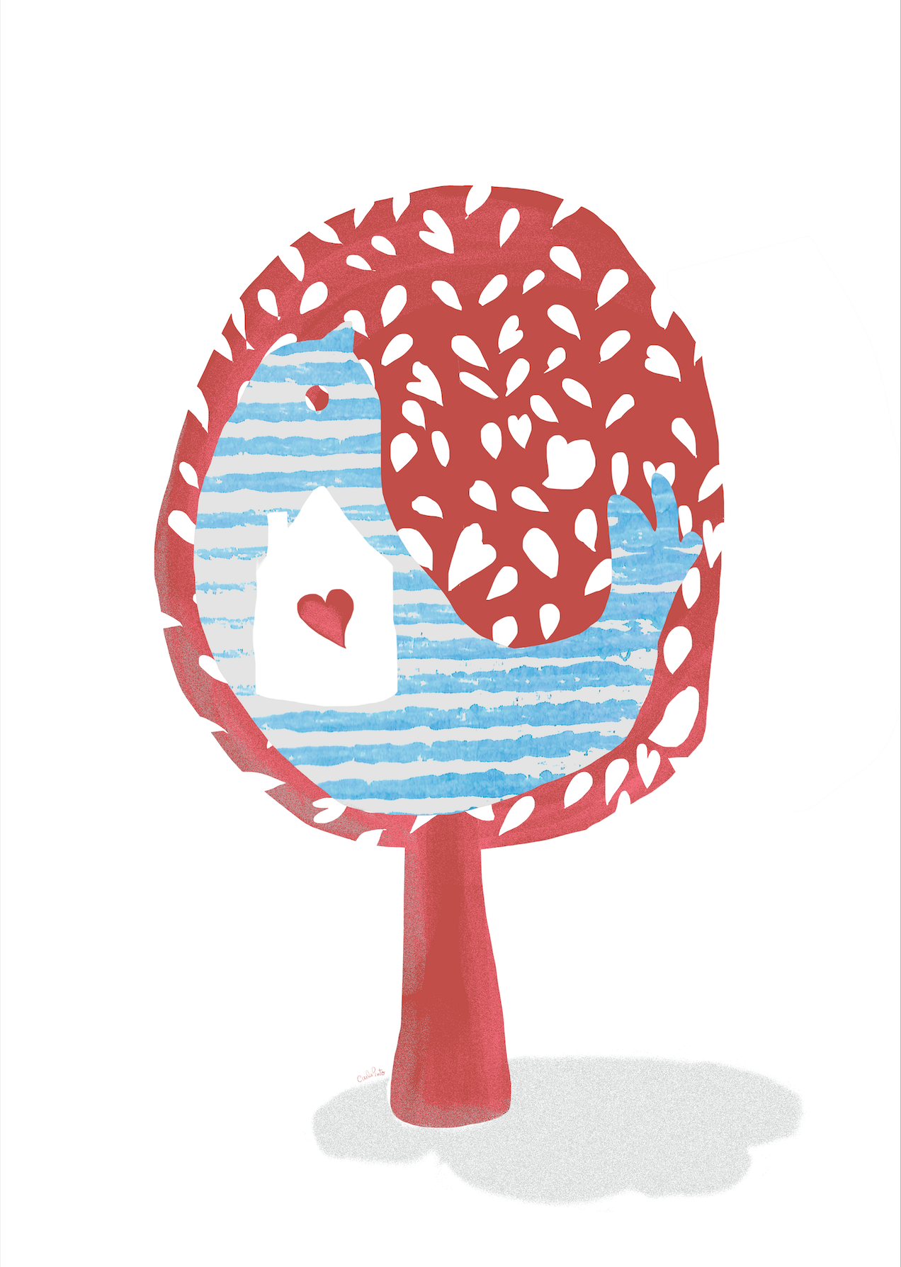 • Ilustração artística de árvore vermelha com pássaro azul listrado e casa com coração