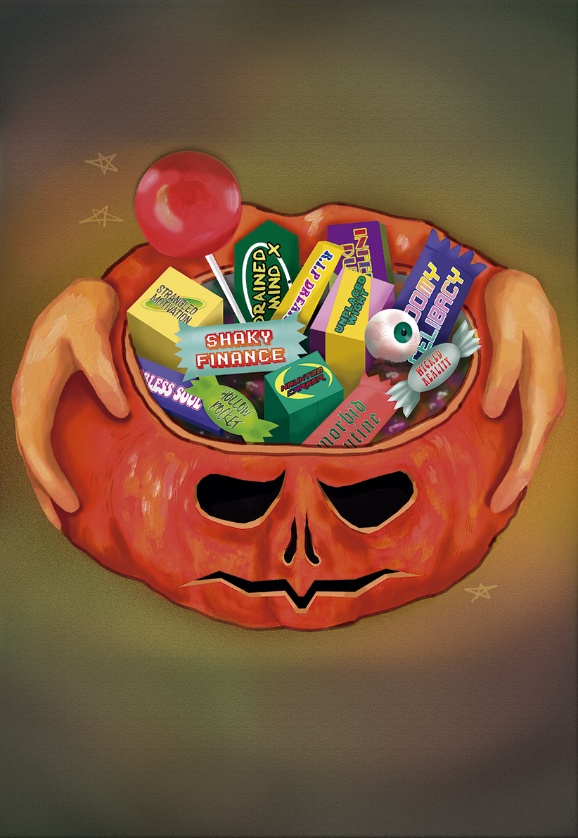 O pesadelo de deixar a vida de adolescente para trás e confrontar se com os desafios da nova vida de adulto. Esta etapa surpreende-nos com um cabaz de travessuras. Escolhe o teu doce tenebroso!
