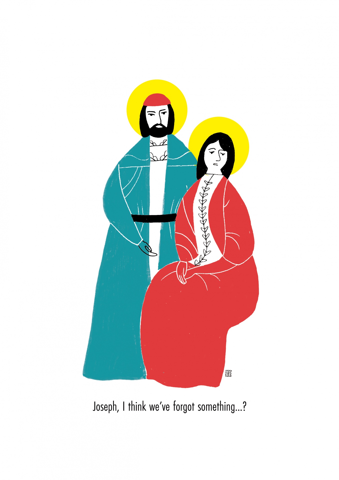 • Desenho de duas figuras religiosas com auréolas amarelas e texto em inglês abaixo.