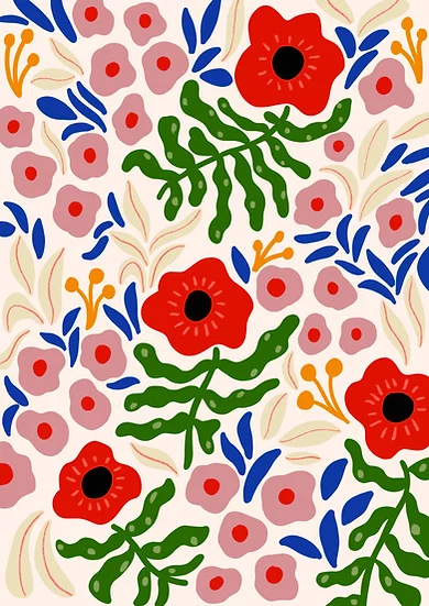 • Padrão floral colorido com flores vermelhas e folhas verdes