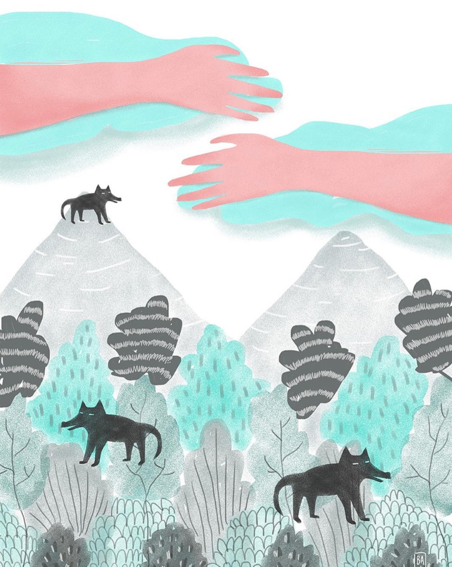 Ilustração de lobos, árvores, montanhas e braços em nuvens azuis.