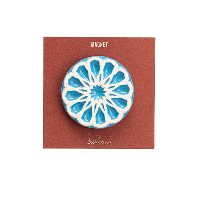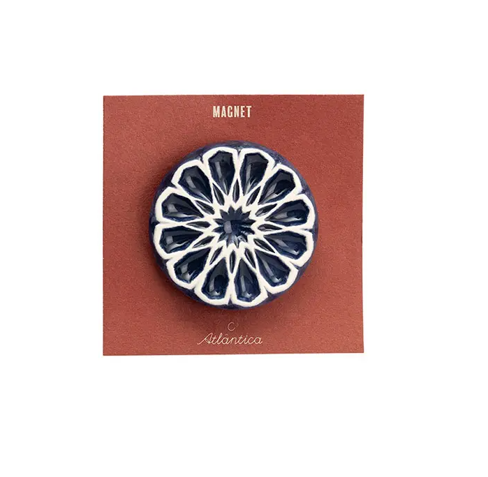 • Íman circular azul e branco com padrão floral em cartão castanho com texto MAGNET e Atlanprima