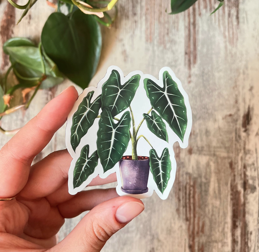 • Autocolante de planta Alocasia em vaso castanho escuro, segurado à mão