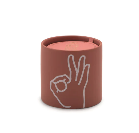 Vela perfumada em recipiente cilíndrico terracota com ilustração de mão a fazer o gesto 'ok'