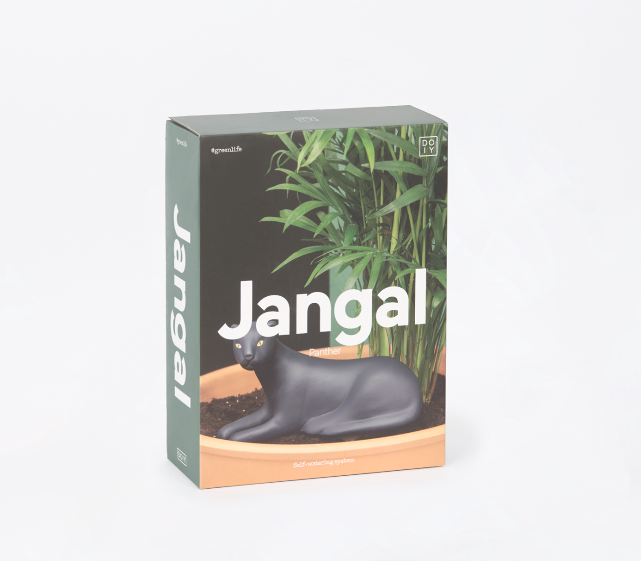 • Embalagem de sistema de auto rega com figura de pantera negra e planta verde
