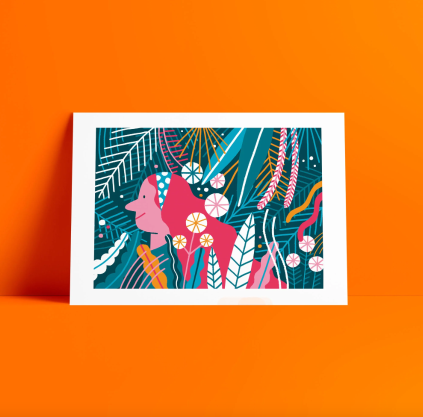 • Postal ilustrado com elementos naturais e personagem feminina sobre fundo laranja