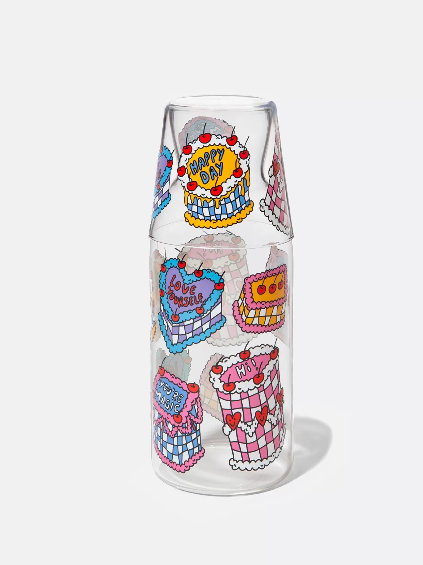 • Jarra e copo de vidro com ilustrações de bolos coloridos e fundo amarelo