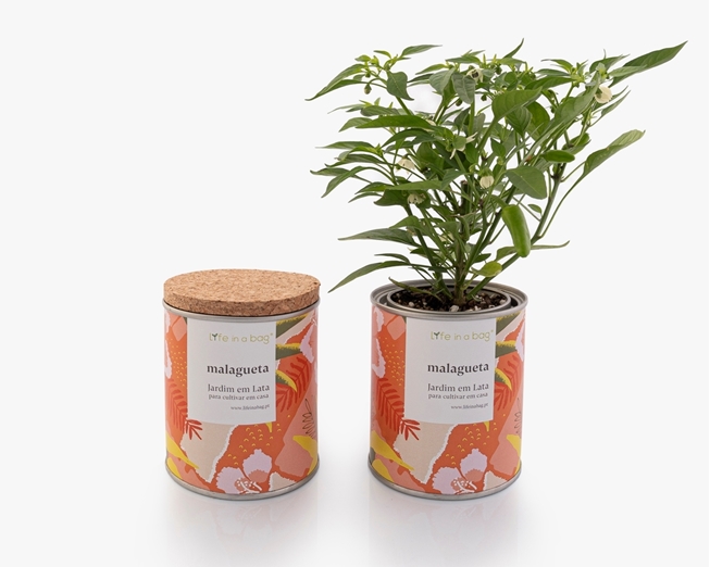 Uma lata de tinta que contém tudo o que necessita para fazer crescer a sua malagueta. Só tem que abrir a tampa de cortiça e regar.
