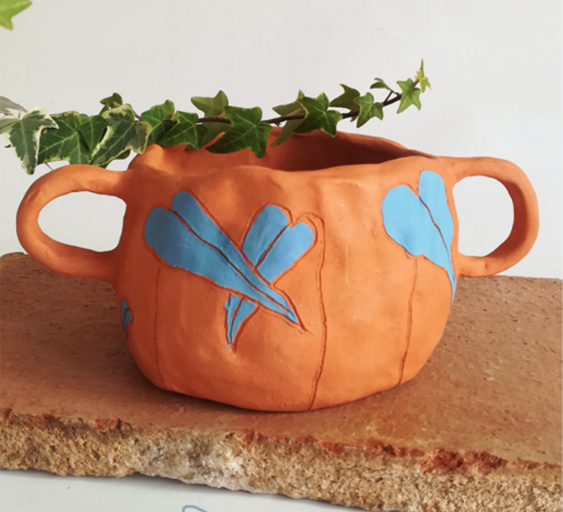 Técnica :  Pinch Pot em barro vermelho, desenhos esgrafitados e pintados