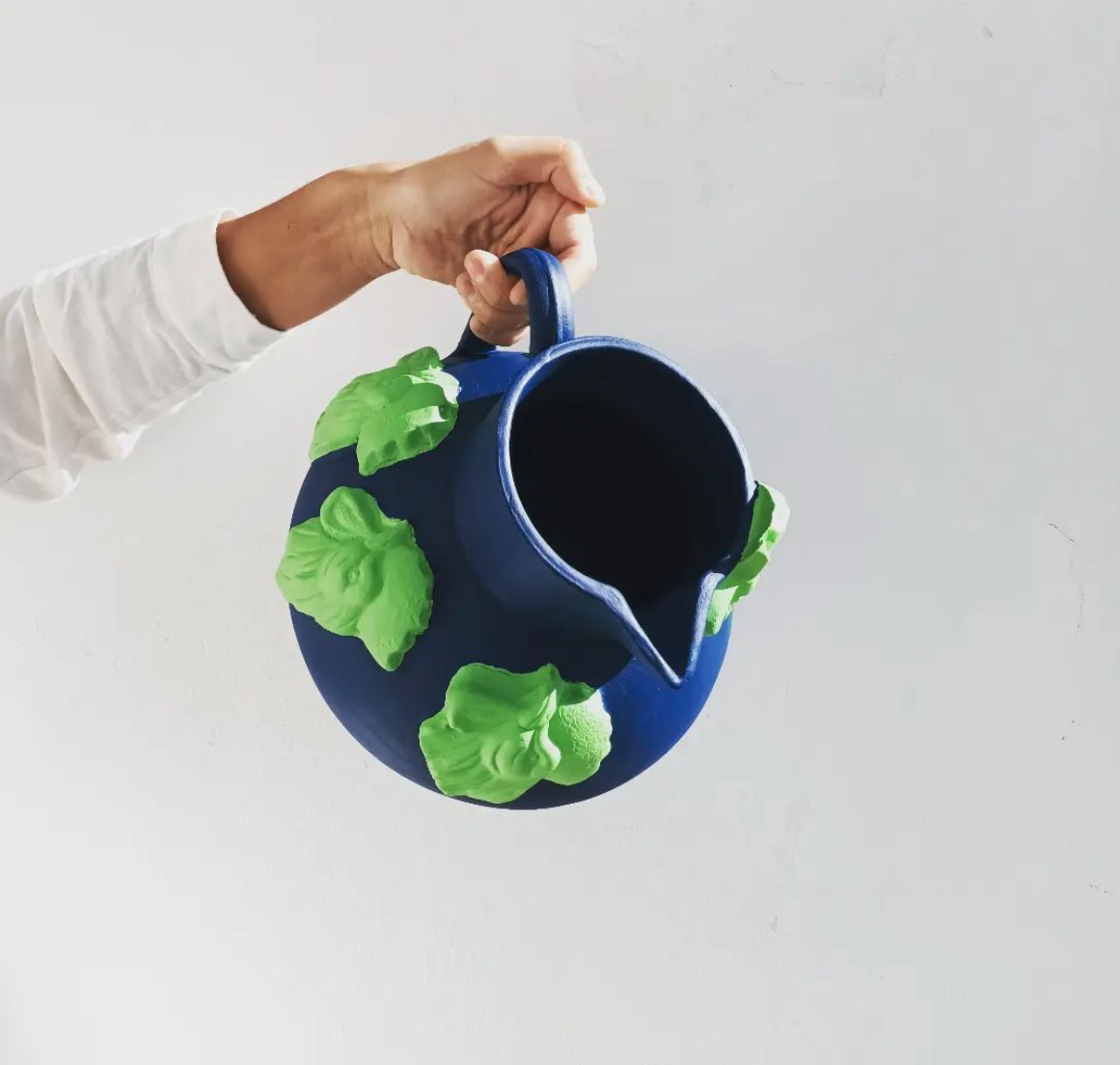 • Jarro cerâmico azul com folhas verdes em relevo segurado por mão com camisa branca