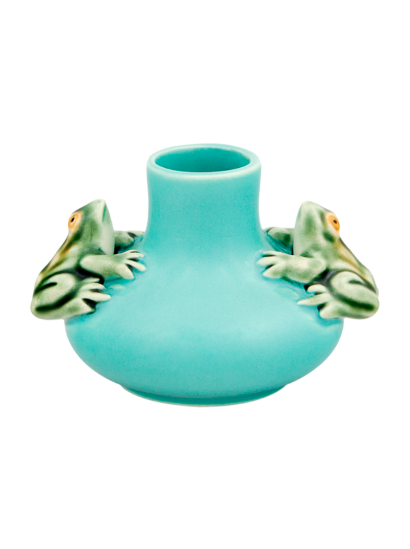 • Vaso cerâmico azul turquesa com rãs verdes decorativas nas laterais