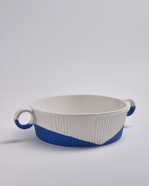 • taça de cerâmica branca e azul com duas pegas redondas