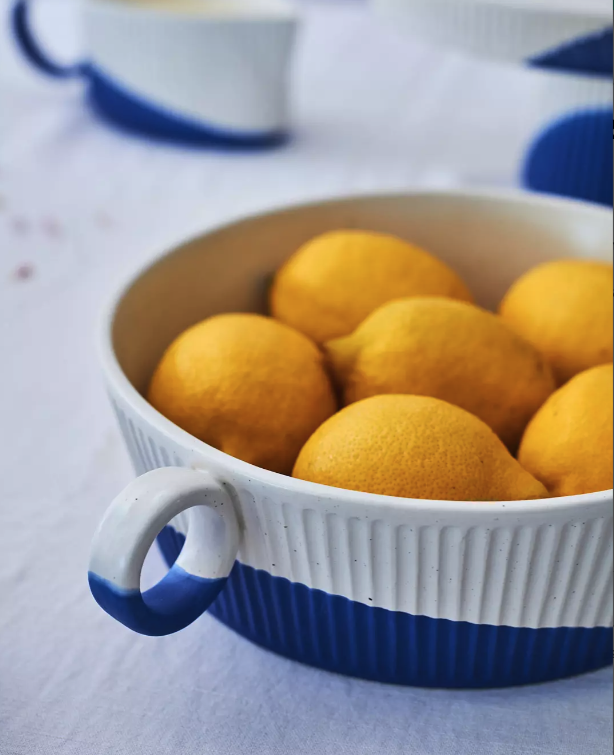 • Taça cerâmica branca e azul com limões amarelos