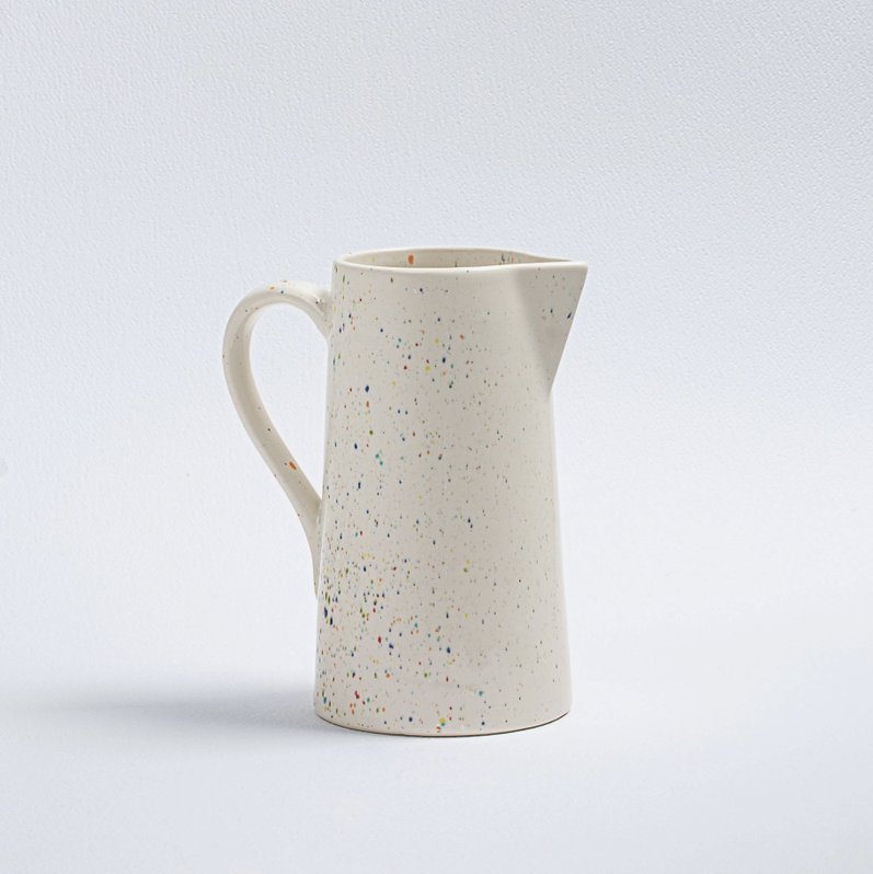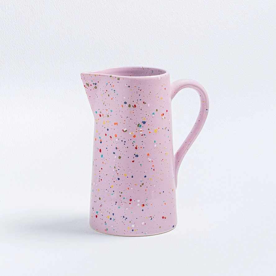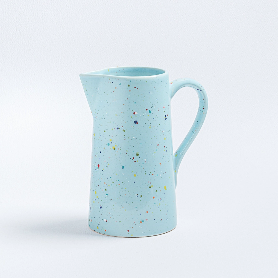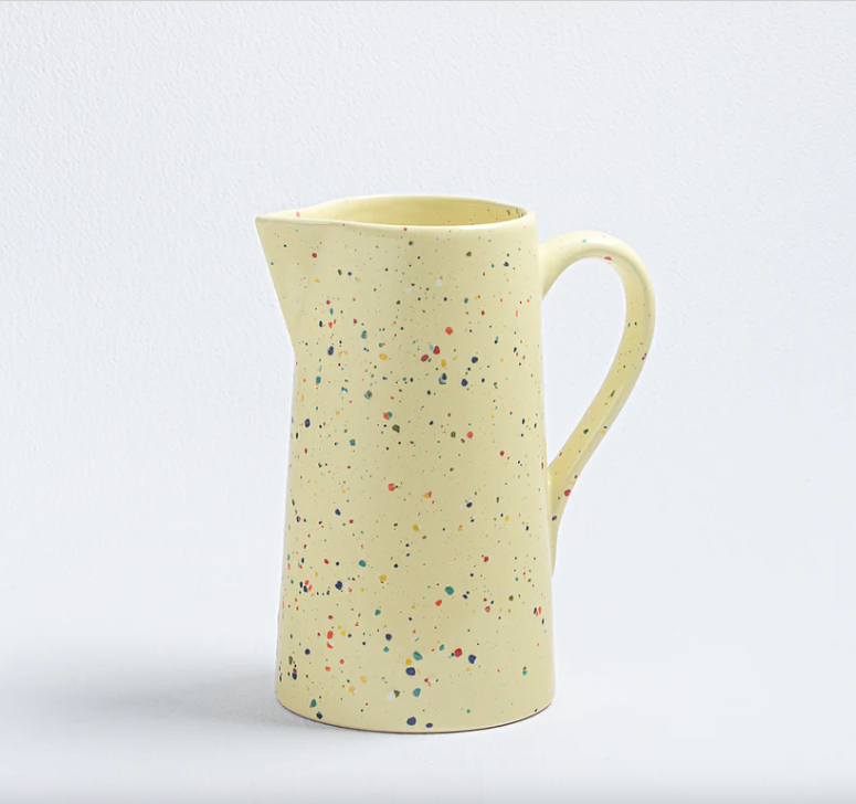 Este jarro, com um acabamento de vidrado brilhante e cores alegres, funciona perfeitamente para o uso diário.