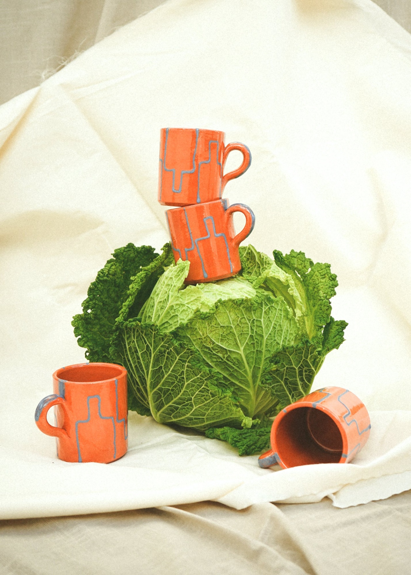 • Quatro chávenas de cerâmica cor de laranja com padrão azul empilhadas e distribuídas sobre uma couve e tecido bege claro