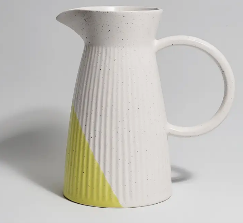 Jarro de cerâmica pintado à mão com um toque de amarelo.