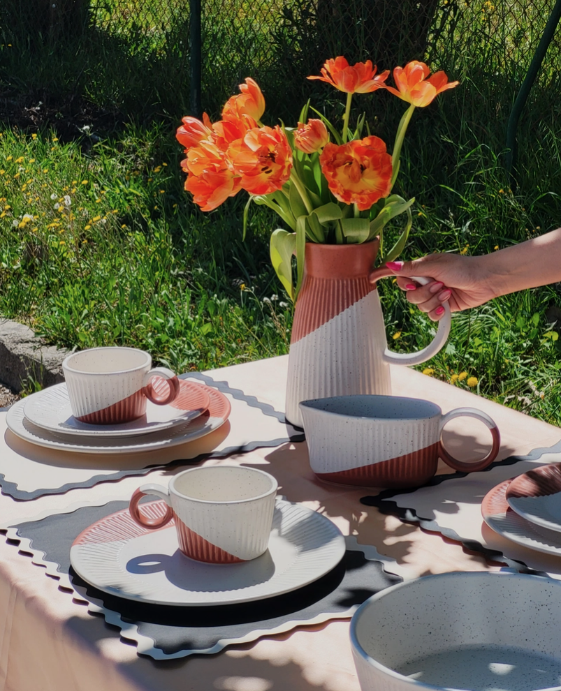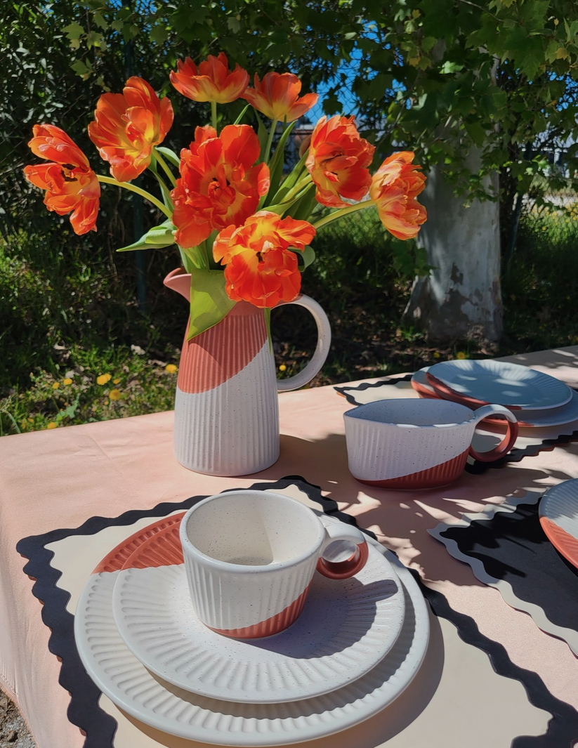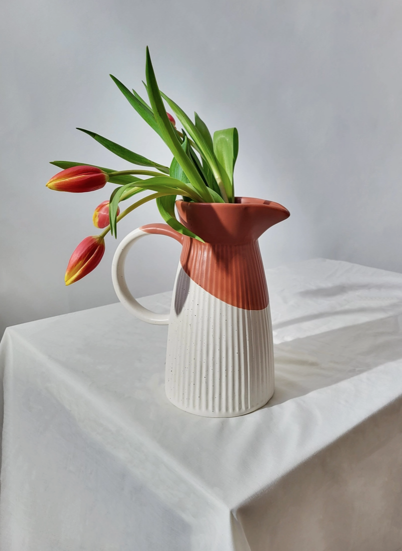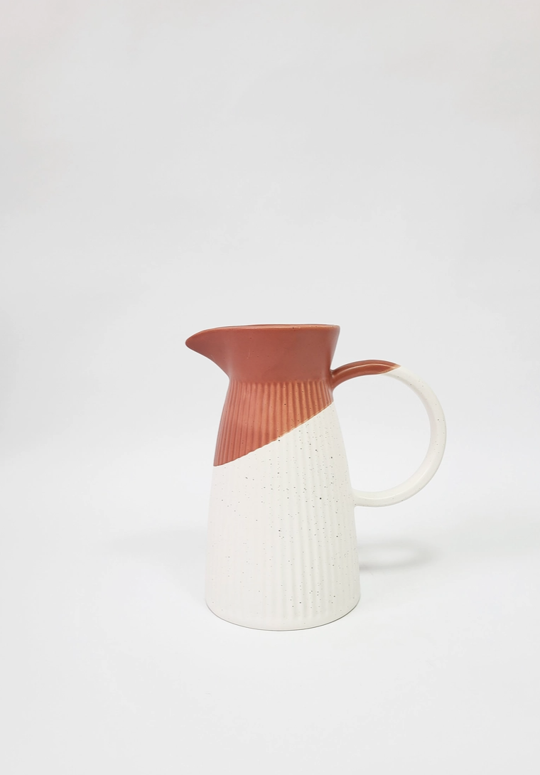 Um jarro, um acessório de mesa, uma peça decorativa, uma peça de arte! A generosa capacidade da nossa Tália Pitcher permite servir grandes quantidades das suas bebidas favoritas. Desde chá gelado e limonada a água infundida de frutas ou mesmo cocktails, este jarro atende a uma grande variedade de desejos sedente-saciantes. Jarro cerâmico pintado à mão com um toque de cor (Azul, Preto ou Terracota) Todas as peças “Pó de Barro” são únicas. Devido à produção artesanal todos os produtos apresentam variações de formas, cores e acabamentos.