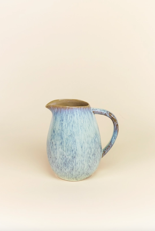 • Jarro de cerâmica azul com acabamento castanho sobre fundo bege
