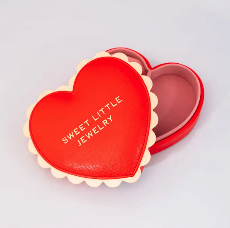 The sweetest way to organize your jewelry. This scalloped box is made of smooth leatherette and features a spot for your necklaces, bracelets, rings, and more.
