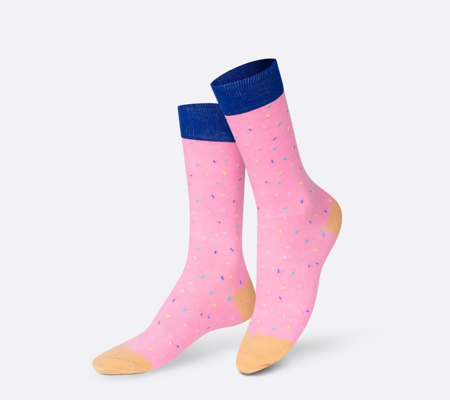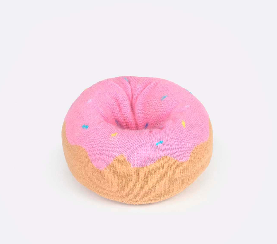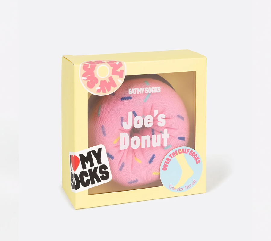 • Meias em forma de donut cor-de-rosa em caixa amarela com autocolantes