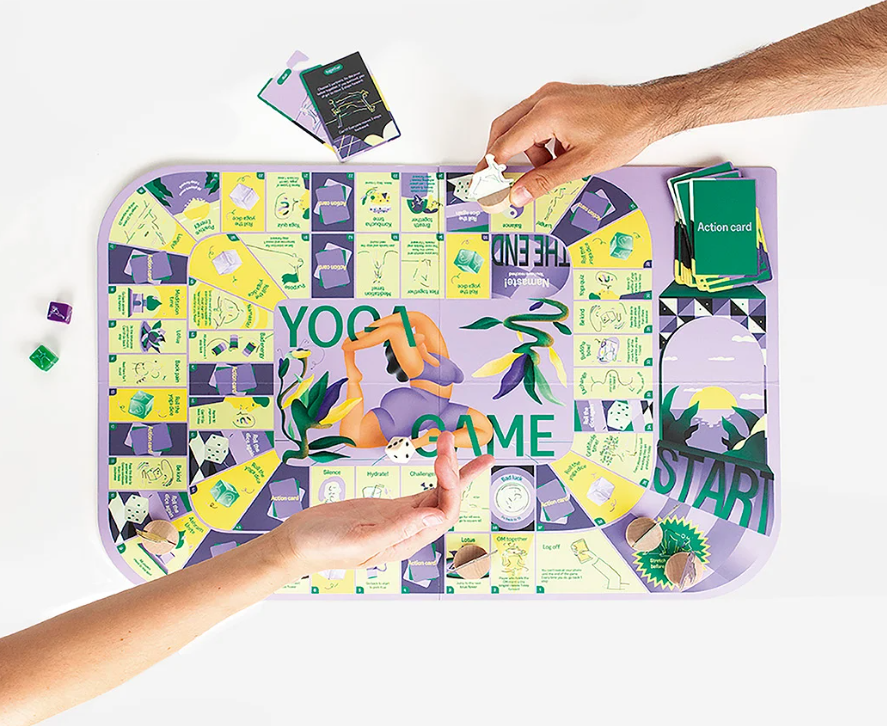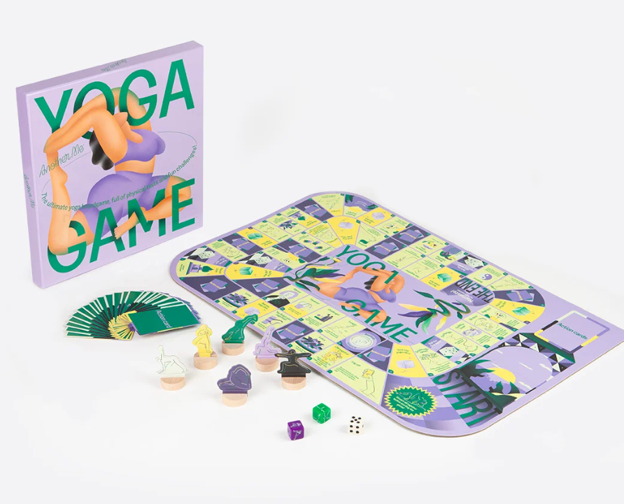 • Jogo de tabuleiro Yoga Game com peças de yoga coloridas e cartas.