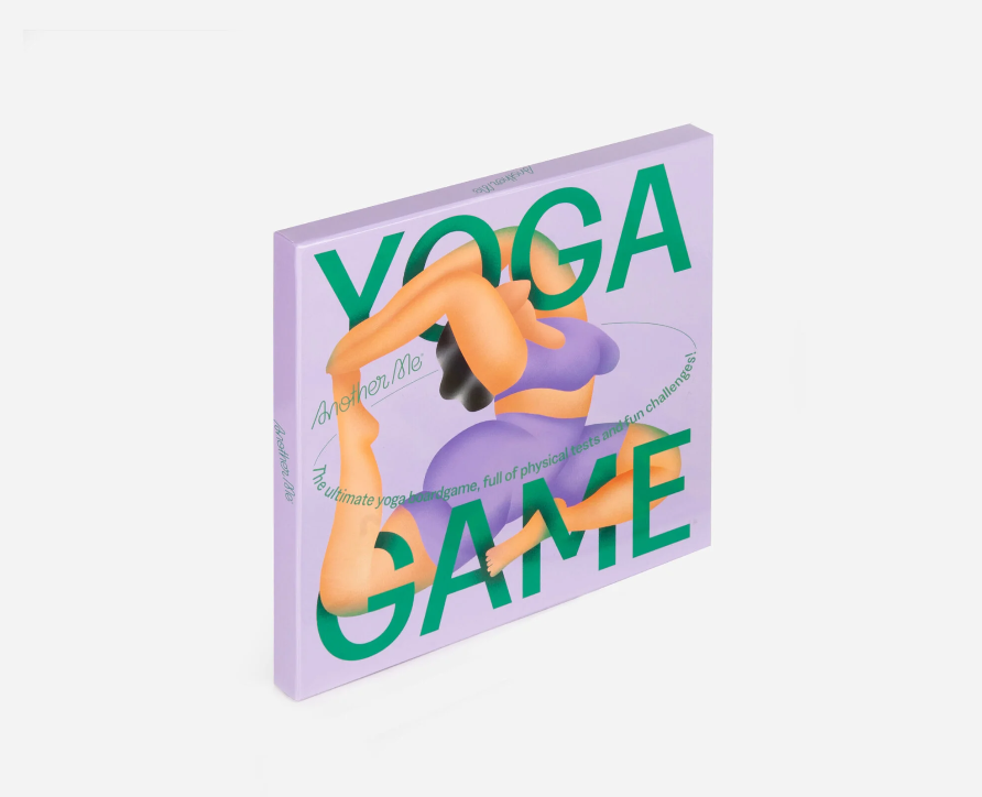 Caixa quadrada lilás do Jogo Yoga Game com figura colorida de yoga na capa