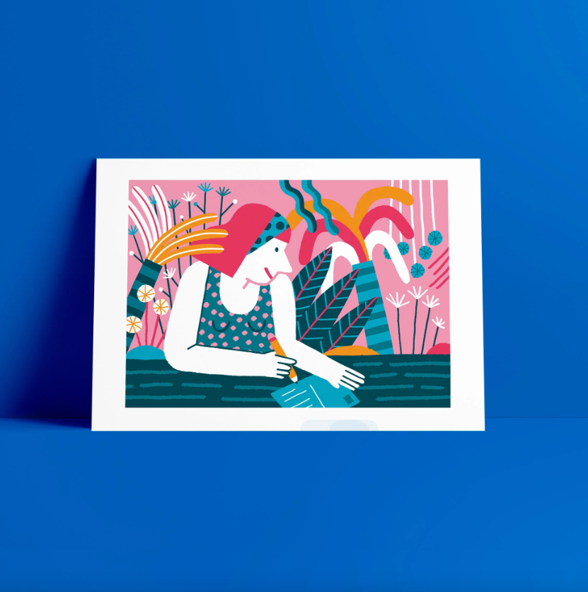Cartão postal colorido com ilustração de pessoa a escrever e plantas.
