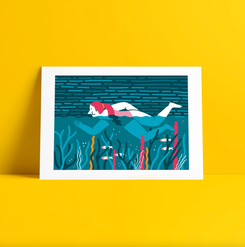 Quadro com ilustração de mulher a nadar debaixo de água e plantas aquáticas, com moldura branca