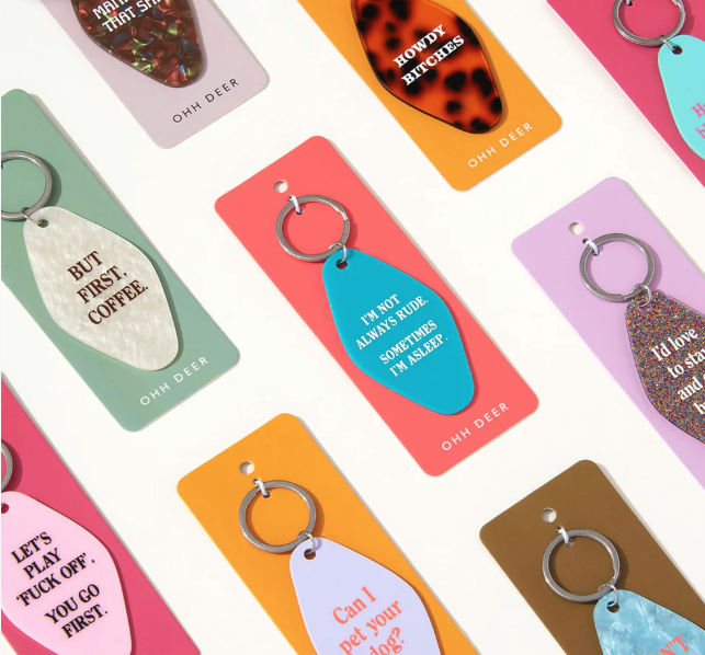 • Porta-chaves coloridos com textos em inglês, dispostos em padrão sobre fundo branco