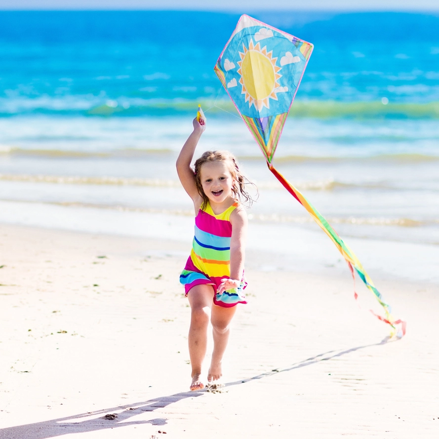 • Criança na praia a voar um papagaio azul com sol amarelo