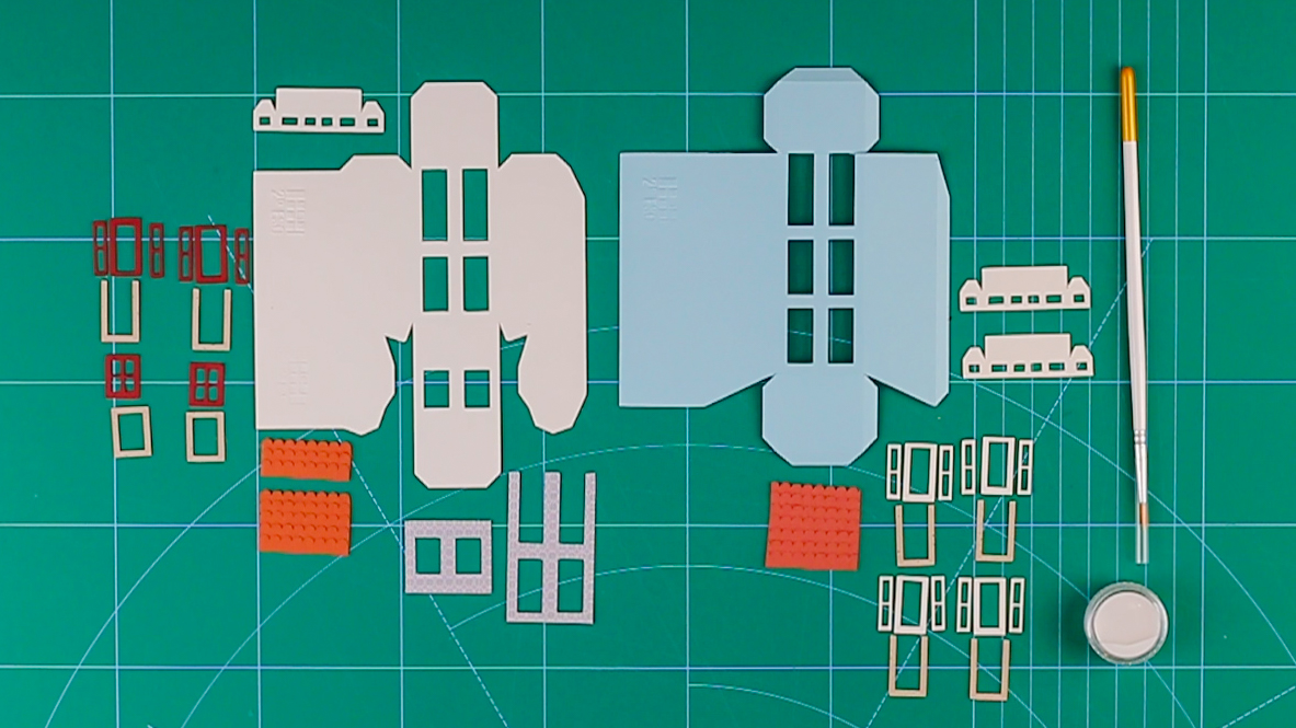 • Peças de cartão e plástico para modelismo, pincel e tinta sobre mesa de corte verde