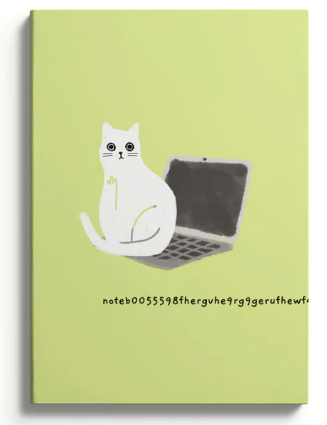 Caderno verde com ilustração de gato branco e portátil cinzento