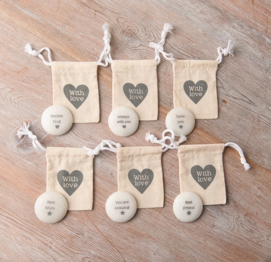 • Pedras decorativas com mensagens e saquinhos de tecido com cordão