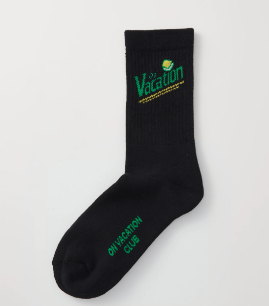 Meia preta com texto verde e amarelo 'Vacation' e 'ON VACATION CLUB'