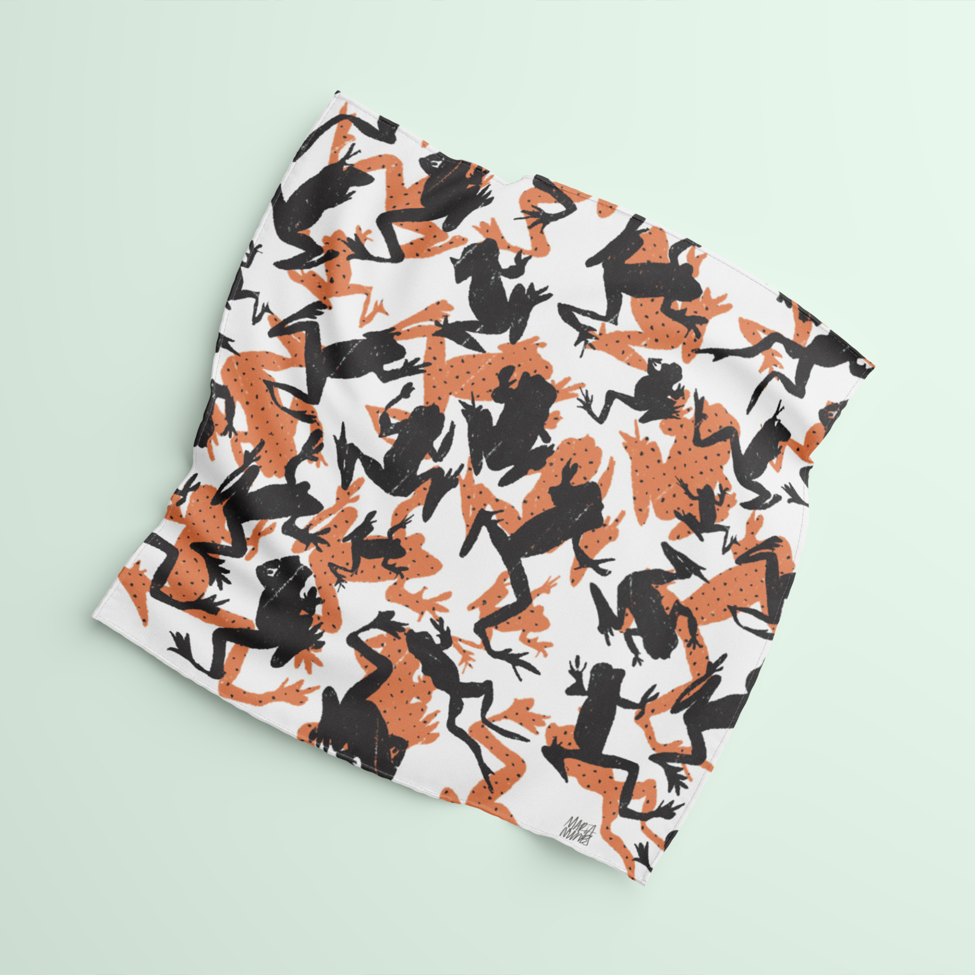 • Lenço com padrão de rãs em preto e laranja sobre branco pendurado.