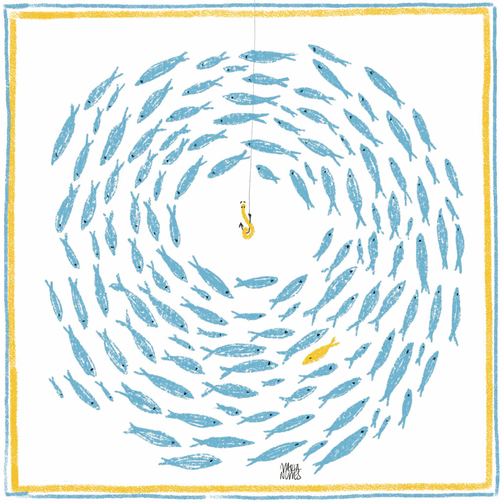 • Ilustração de cardume de peixes azuis e um peixe amarelo com anzol