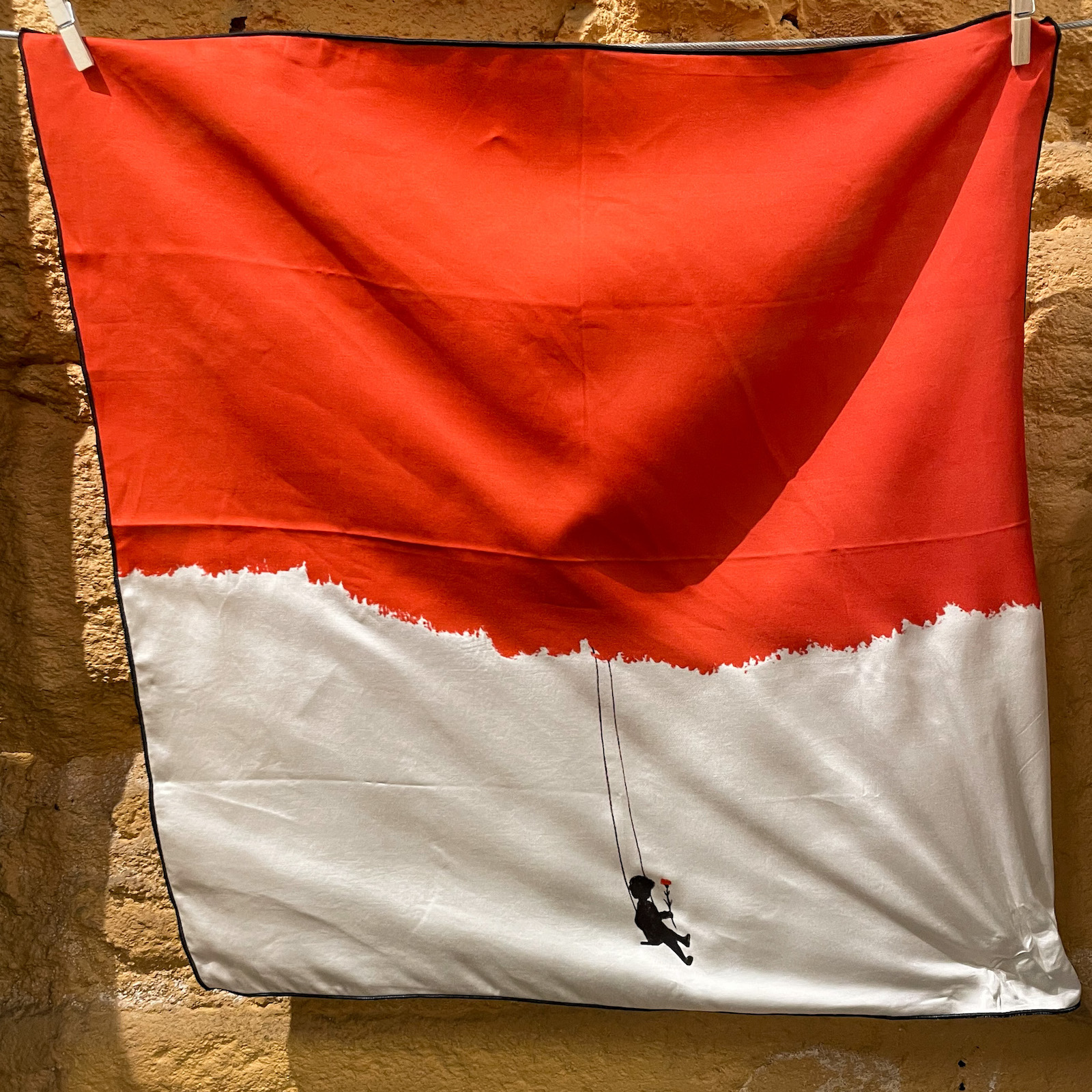 • Lenço vermelho e branco com ilustração de criança em baloiço