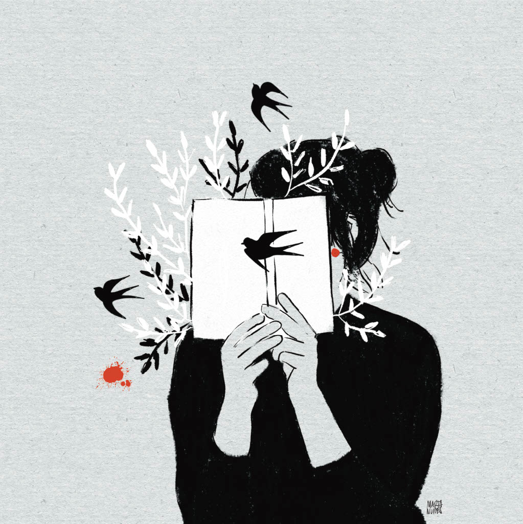 • Ilustração de pessoa com livro aberto do qual saem pássaros e ramos em ambiente cinzento.