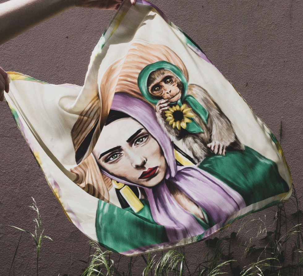 • Lenço com estampa artística de mulher e macaco segurando girassol