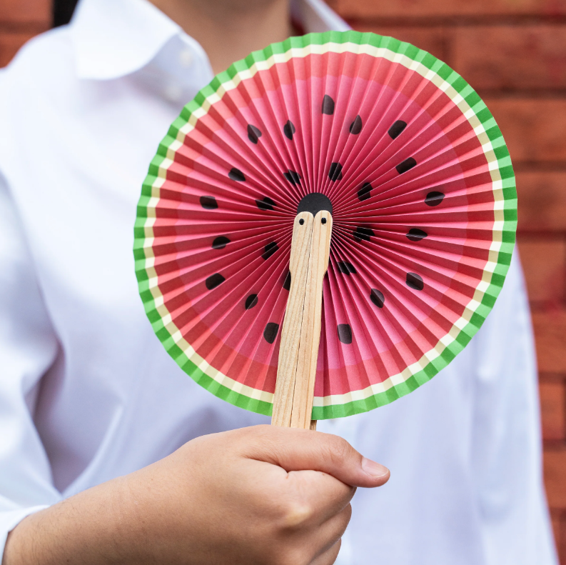 • Leque de papel dobrável com padrão de melancia, segurado por mão contra fundo de tijolos