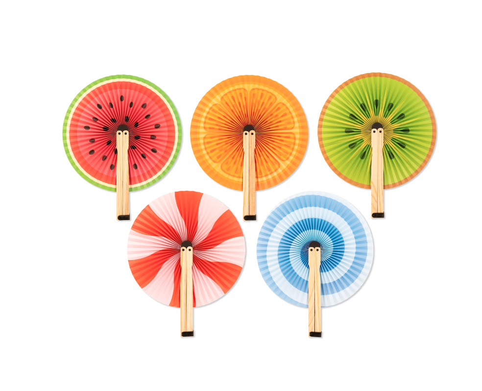 Cinco leques de mão coloridos com cabos de madeira sobre fundo branco