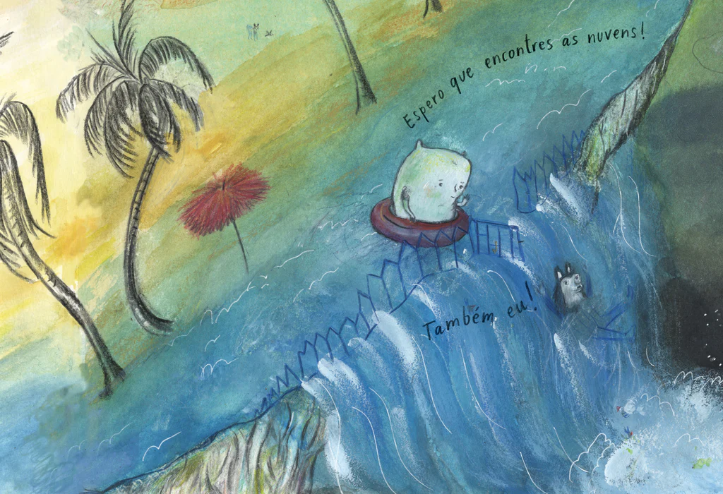 • Capa de livro 'A TERRA das NUVENS' com personagem animal a atravessar ponte vermelha num cenário com céu azul e nuvens