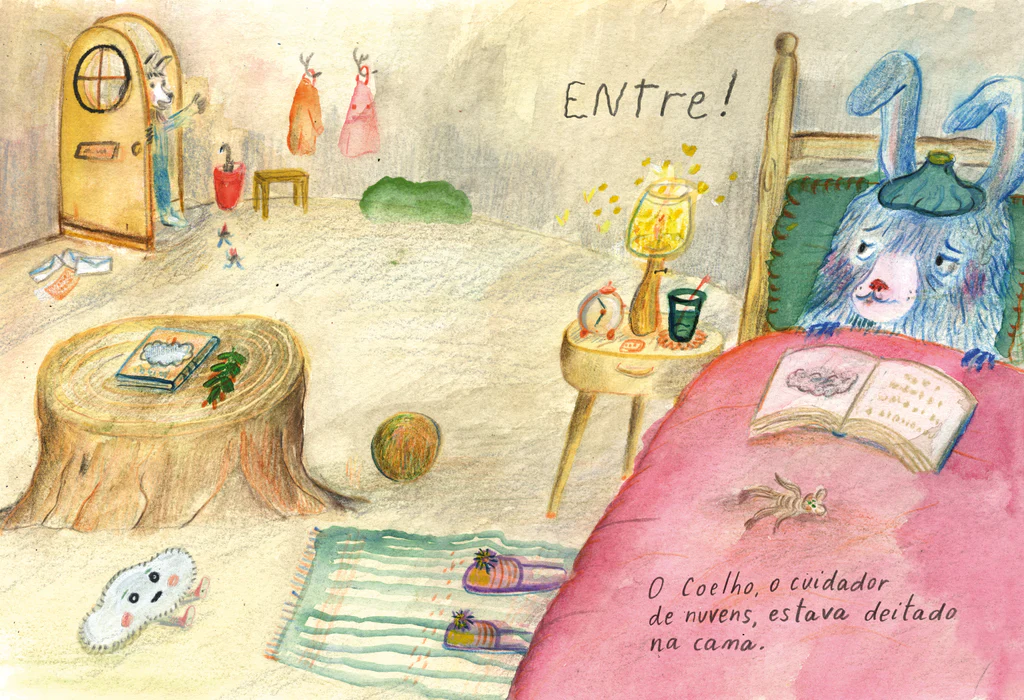 • Ilustração de quarto com coelho azul na cama, mesa de tronco, tapete listrado e texto ENTre e O Coelho, o cuidador de nuvens, estava deitado na cama.