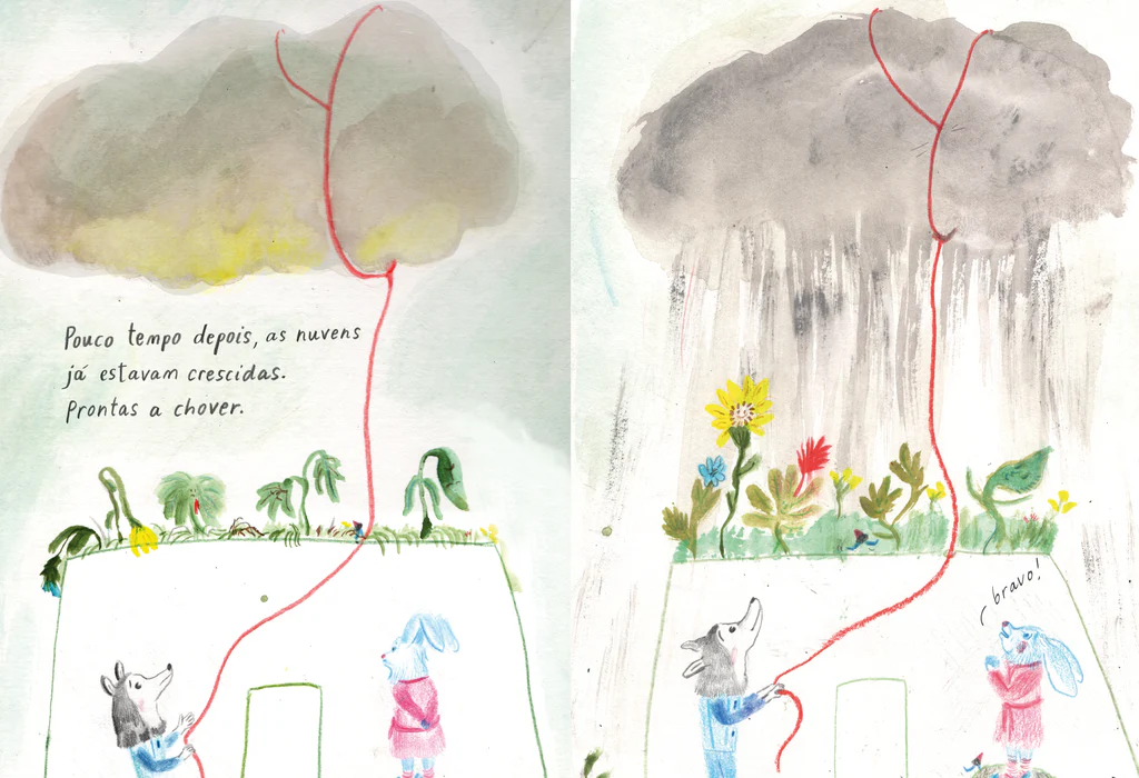 • Ilustração com personagens animais, fio vermelho, nuvens e plantas sob chuva