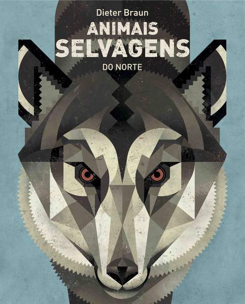 Capa de livro com ilustração geométrica de um lobo em tons cinza, branco e preto.