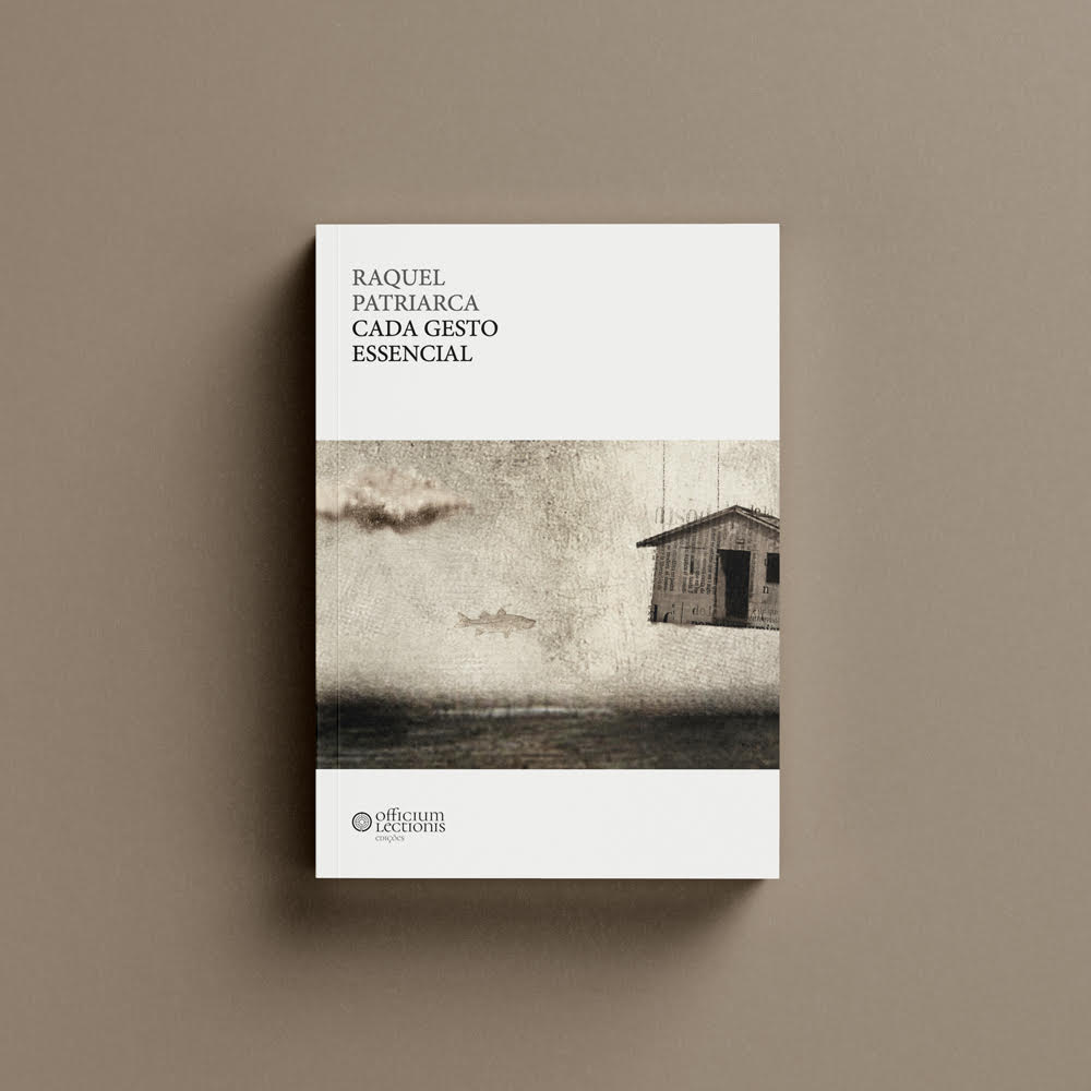 • Livro 'Cada Gesto Essencial' de Raquel Patriarca com capa branca e imagem de casa suspensa em tons sépia