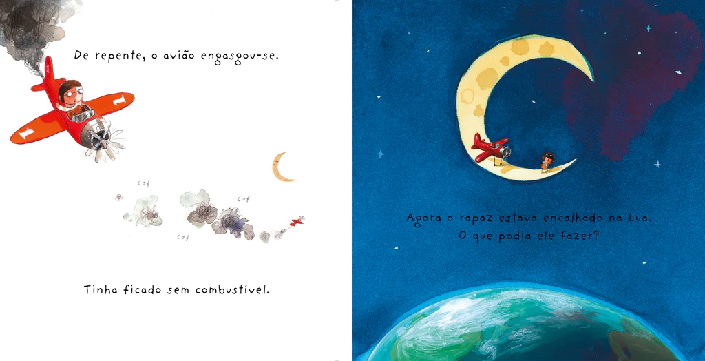 Lembram-se das aventuras do rapaz que encontrou um pinguim perdido e o acompanhou até ao Polo Sul? Sim, aquele rapaz que queria apanhar uma estrela e ser seu amigo. Bem... esse rapaz encontrou um avião na despensa e decidiu logo ir dar uma volta nele. Mas, de repente, o avião ficou sem combustível e despenhou-se na Lua. Agora, o rapaz precisa mesmo de encontrar o caminho para casa...