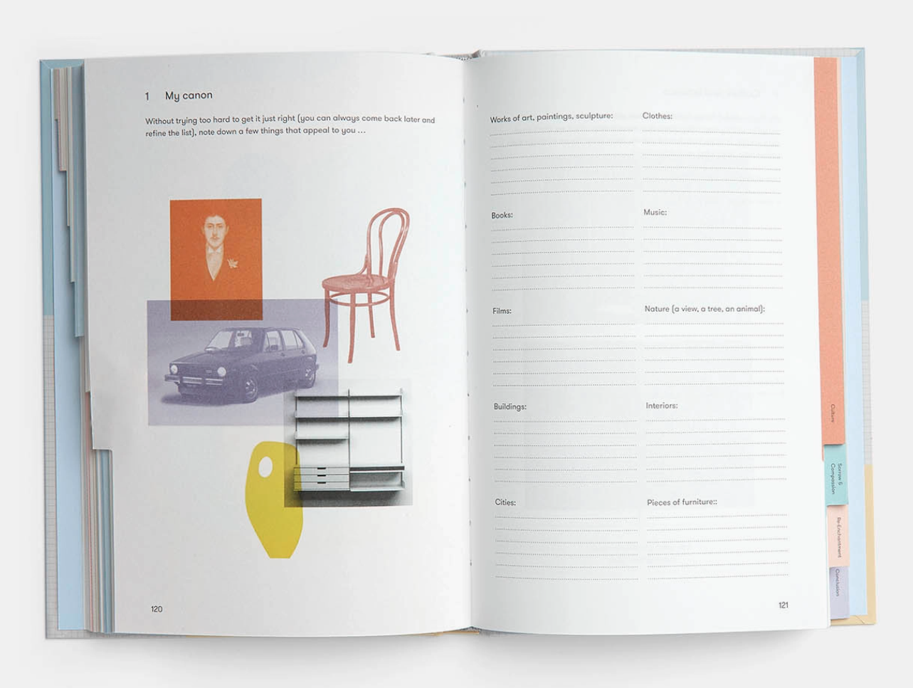 • Livro aberto com texto, ilustrações e espaços para escrita organizados em várias categorias.