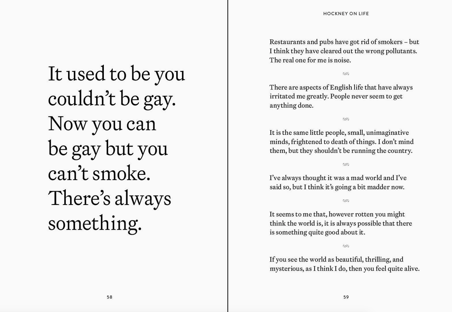 De observações quotidianas — "O olho está sempre em movimento; se não estiver em movimento, está morto" — a insights artísticos como "a cor pintada será sempre melhor do que a cor impressa, porque é o próprio pigmento", David Hockney tem um talento especial para capturar verdades profundas em declarações concisas.
