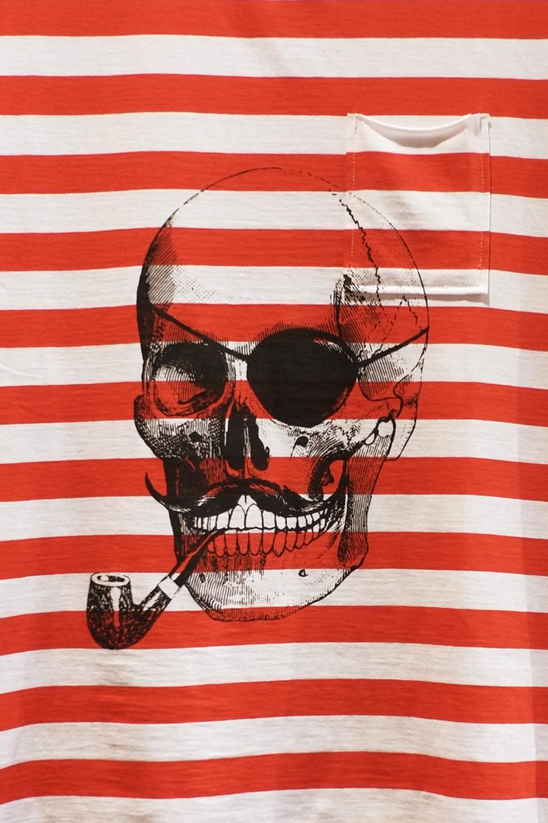• Camiseta listrada vermelha e branca com estampa de caveira com bigode e cachimbo e bolso no peito